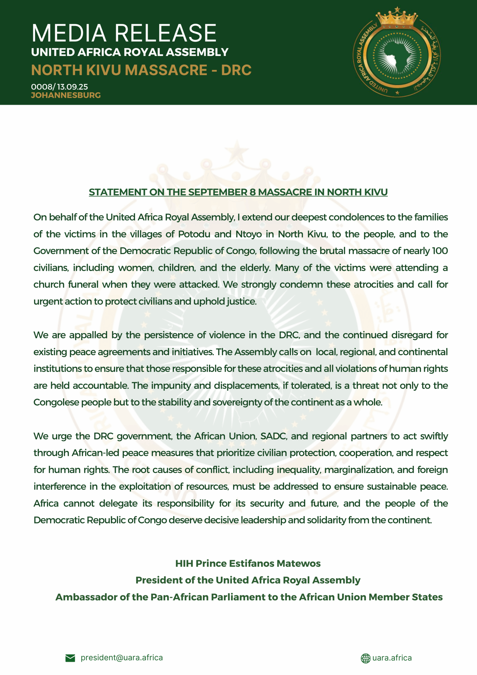 The President of the United Africa Royal Assembly, HIH Prince Estifanos Matewos, has issued a formal statement condemning the killing of nearly 100 civilians in the villages of Potodu and Ntoyo in North Kivu Eastern Democratic Republic of Congo. Speaking on behalf of the Assembly, he expressed condolences to the victims’ families, the Congolese people, and their government, while voicing grave concern over the ongoing violence in North Kivu and the disregard for peace agreements. The statement calls for accountability for perpetrators, urges the African Union, SADC, and regional partners to mobilize African-led peace support measures, and emphasizes the importance of long-term strategies to address the root causes of conflict. The Assembly has reaffirmed its commitment to Pan-African solidarity, stressing that Africa must take responsibility for its own peace and security.