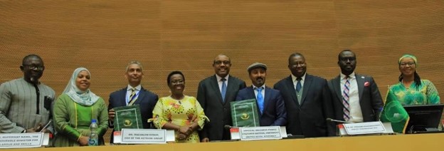 The signing ceremony took place in the Nelson Mandela Hall at the African Union Headquarters, with Mr. Mulualem Syoum, the CEO of the AeTrade Group, and Dr. Liaqat Alli Azam, Director General of the United Africa Royal Assembly, representing His Imperial Highness Prince Estifanos Matewos. The esteemed gathering included dignitaries such as H.E. Hailemariam Desalegn, former Prime Minister of Ethiopia and Chairman of the AeTrade Group, H.E. Dr. Monique Nsanzabaganwa, Deputy Chairperson of the African Union Commission, and other notable figures.